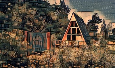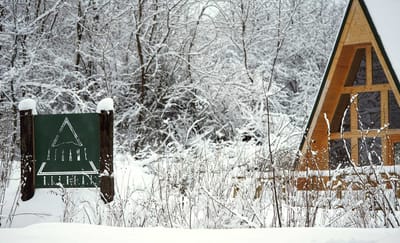 Cuprinde totemul Aframe Retreat de culoare verde si fatada cabanei de tip A toate acoperite de zapad...